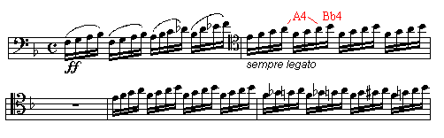 Tchaikovsky, Peter. Symphony No. 4, fourth movement, mm. 26-32 after rehearsal letter B. Ewell, Terry B. (20 August 1994). A4 to Bb4 throughout use Cooper p. 278 for A4 and open L. H. C hole for Bb4. All A4s in the passage may be played with Cooper p. 278.