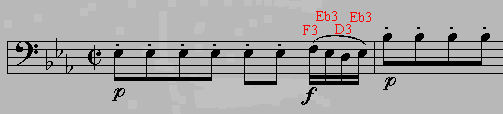 Mozart, W. A. Magic Flute, overture, F3-Eb3-D3-Eb3 sixteenth-note turn. Author? First Eb3 same as Cooper p. 85 with Eb key. Second Eb3 same as Cooper p. 87 but no Eb key.