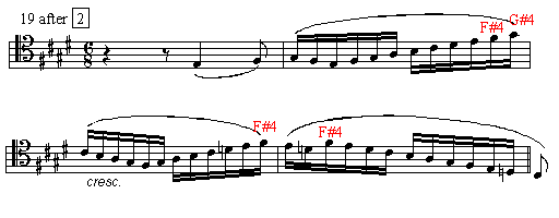 Second movement, 20 measures after rehearsal number 2, for the first F#4 use Cooper p. 233 and then lift R. H. B and A holes for G#4 (Cooper p. 263 but no whisper key or L. H. half hole). In the next measure use Cooper p. 229 for second F#4. For the final F#4, 22 measures after rehearsal number 2, use Cooper p. 233.