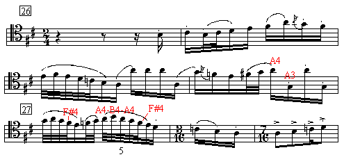 Stravinsky, Igor. l'Histoire du Soldat, Ragtime, after rehearsal number 26. Pence, Homer. In Apfelstadt, Marc and Klimko, Ronald. Bassoon Performance Practice, Teaching Materials, Techniques and Methods. Idaho: University of Idaho, 1993, p. 78. On second F#4 use Cooper p. 228. F#4 in quintuplet use Cooper p. 229. One measure before rehearsal number 27 on F#4 Cooper p. 228. Downbeat at rehearsal number 27 for A4 use Cooper p. 278. B4 in the thirty-second note quintuplet use Cooper p. 312.