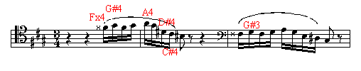 Tchaikovsky, Peter. Symphony No. 5, third movement, 3 measures after rehearsal letter F to 1 after G. Ewell, Terry B. (20 August 1994). For the Fx4 to G#4 to A4 sixteenth notes try:
